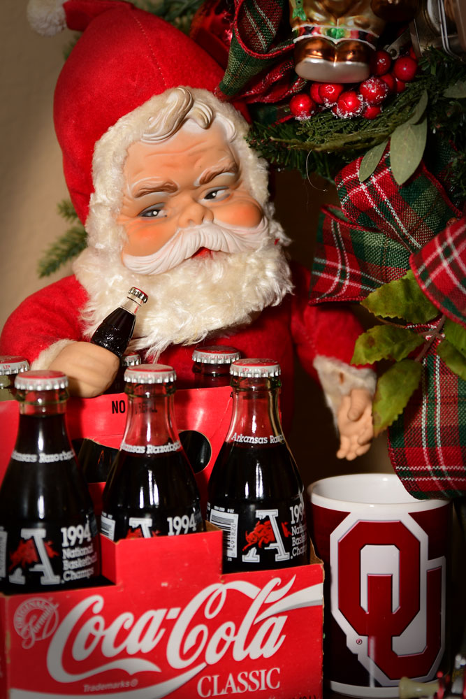 This little Santa is over 60 years of age. He stands about 14 inches tall and was a promotional item from Coca Cola in the late 50’s. A friend of my parents worked in a Coca Cola bottling plant and when these appeared in the office, she secured one and gave it to my mother. This year Santa is standing next to a small tree in the home office that is dressed in an outdoor theme. That carton of Coke in the foreground is a commerative product celebrating the Arkansas Razorbacks men’s basketball national championship in 1994. You will probably see more of that tree and decorations in a later post.