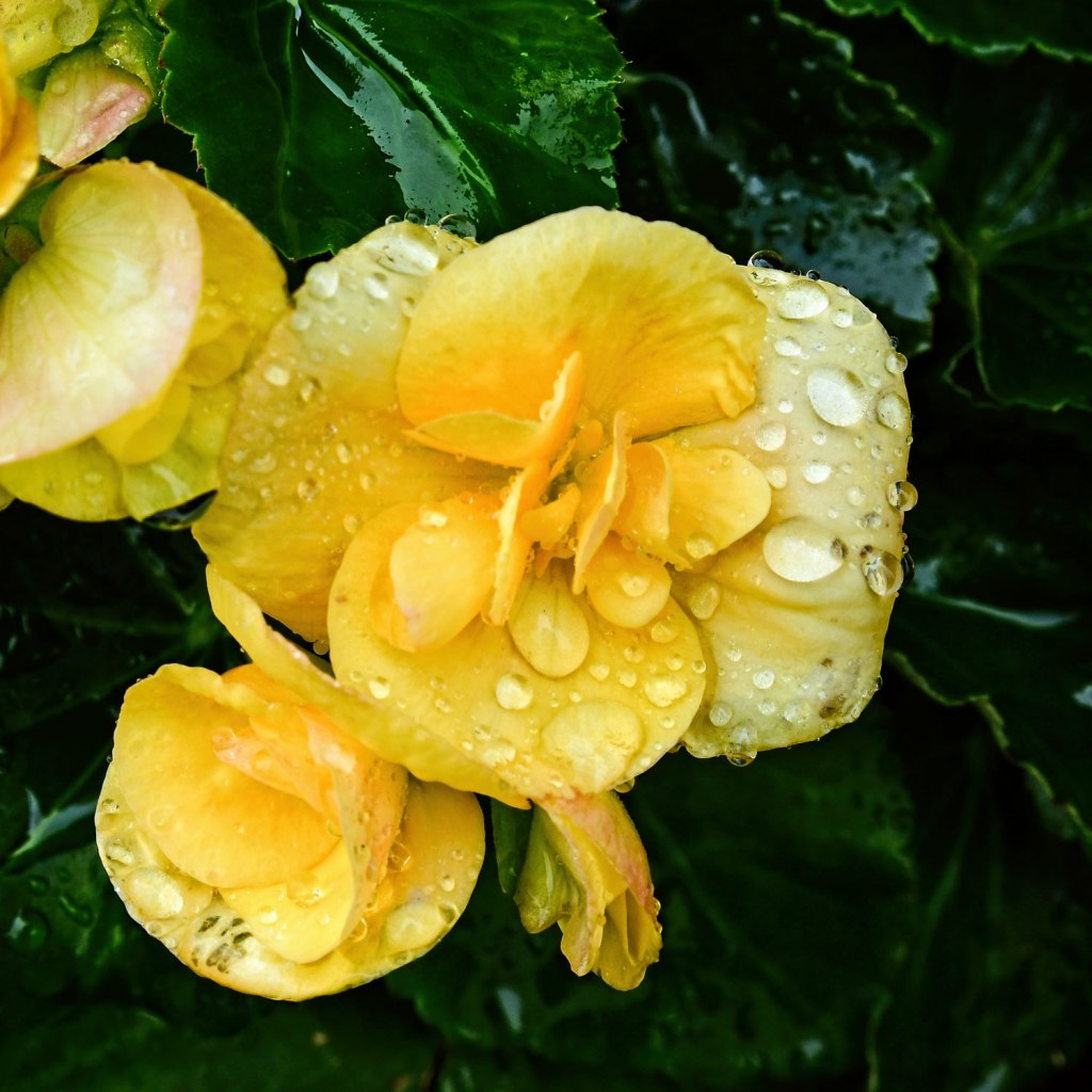 Raindrops keep falling on our heads – but there’s always an upside – the beauty of raindrops on flowers.