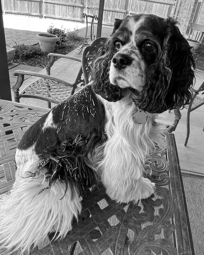 “I got caught rolling in the grass and now, here I am on this table and dad has a comb and a brush. I just hope he doesn’t find any little mats in my coat.”
