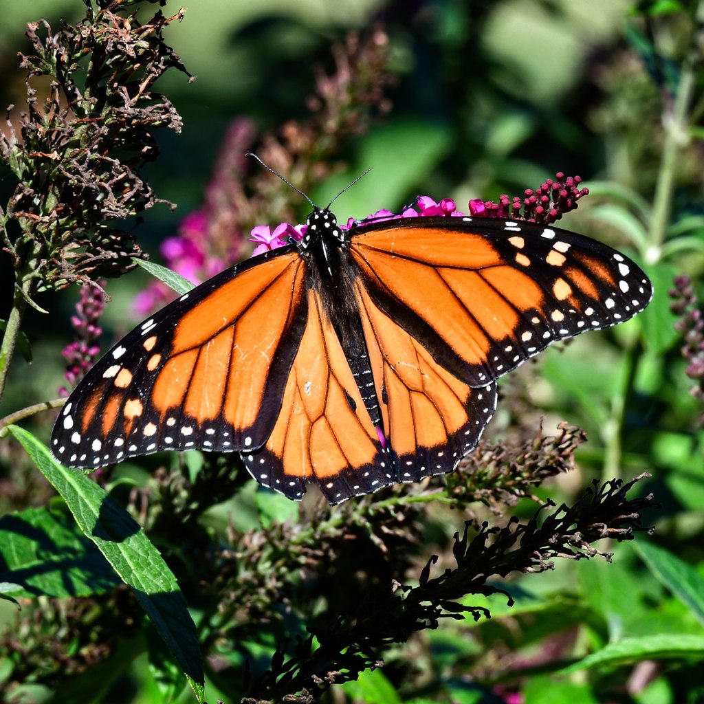 Our butterfly bush continues to draw visitors, including the elusive Monarch. Monarchs have not been coming in large numbers this year. In fact none of the larger butterflies, like the swallow tails, have been common sights this summer. Photo opportunities have been few, so I got pretty excited when this Monarch made an appearance earlier this week.