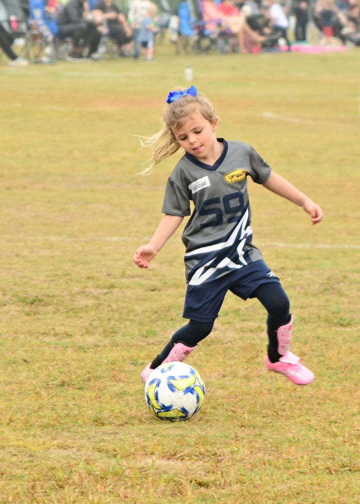 Cute, from the blue bow down to the pink shinguards and shoes. And I love the concentration.