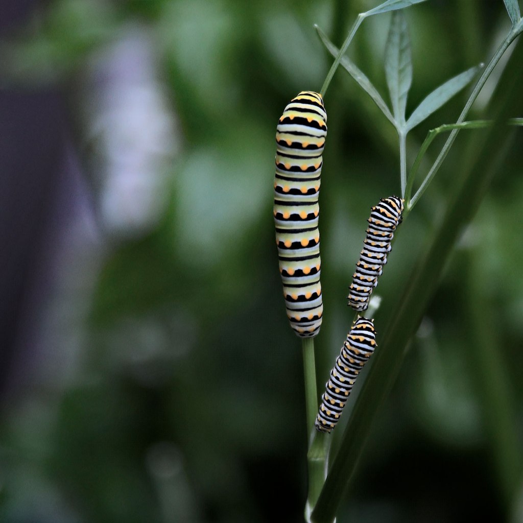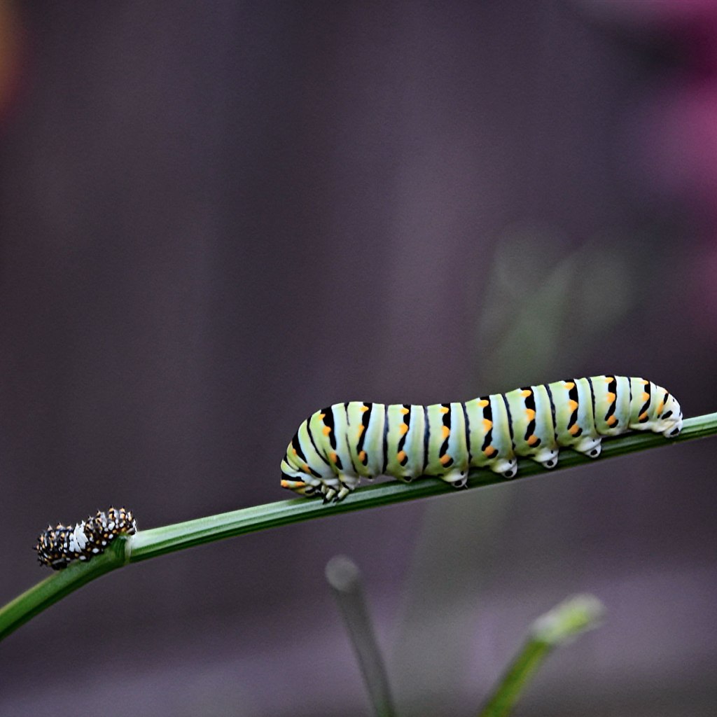 This is a Yellow Swallowtail butterfly. I captured this image last year. It turns out that they like parsley and dill. We had some of those plants in a raised flower bed and the caterpillars laid them to waste. This year my wife planted some more parsley and dill and this past week it was evident that we are going to have yellow swallowtails again!!! Here are a few images of this year’s caterpillars. In a couple of weeks, I will have a whole new crop of butterflies to photograph.