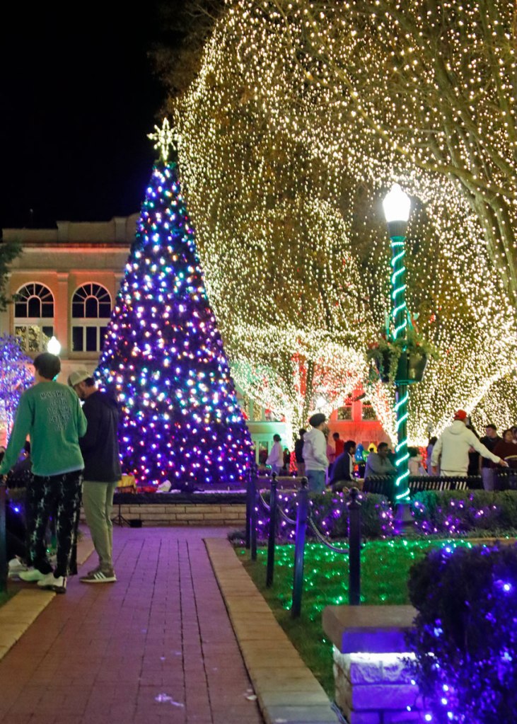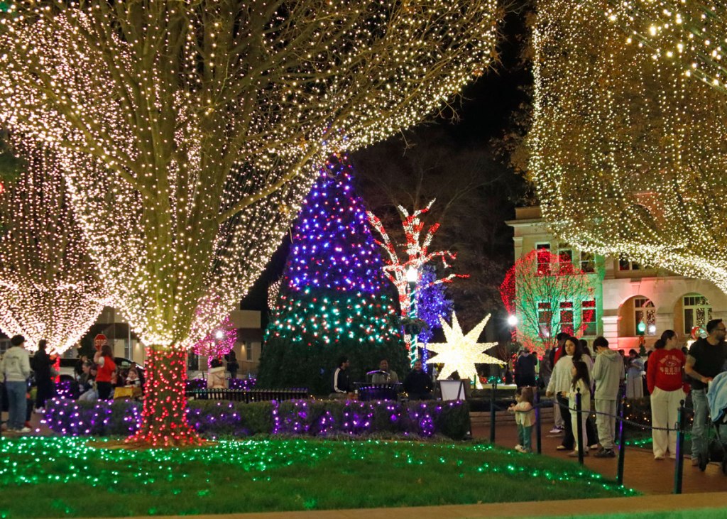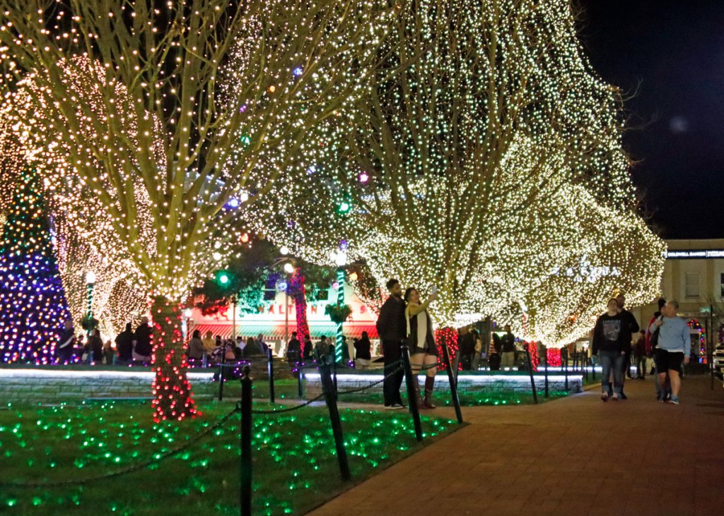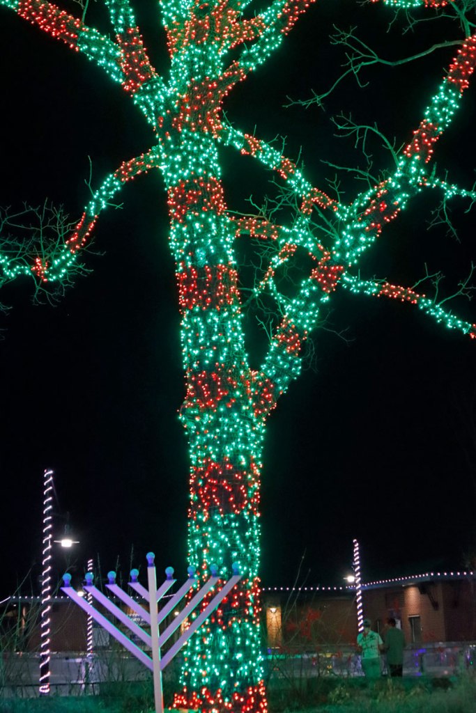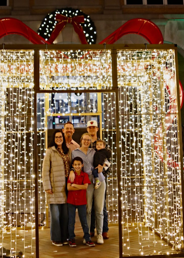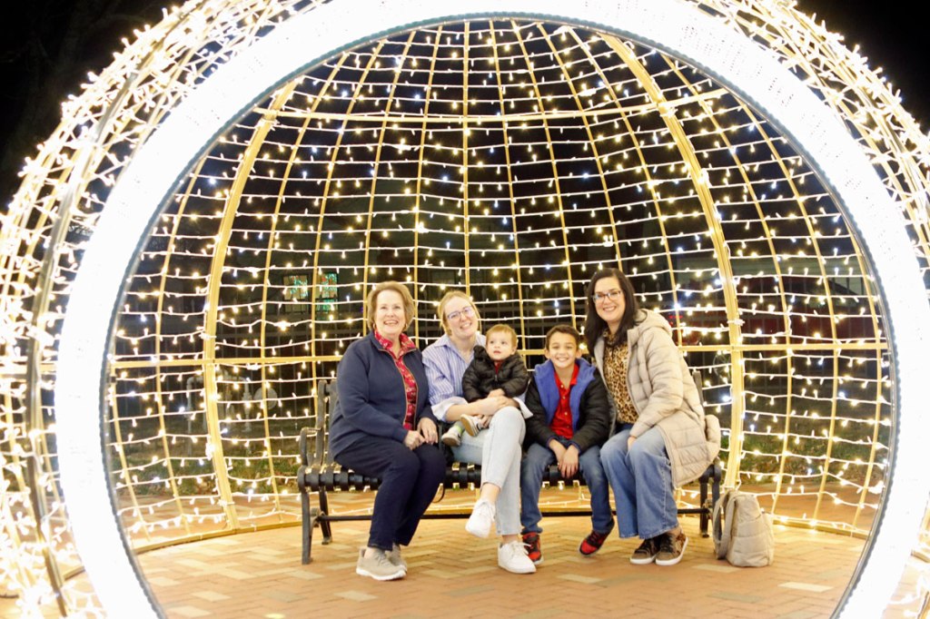 One thing that our town does is light up the town square with an amazing display of lights that include a multitude of photo ops. Here, my wife, our daughter, our middle grand daughter and the great grandsons are sitting in an oversized ornament.