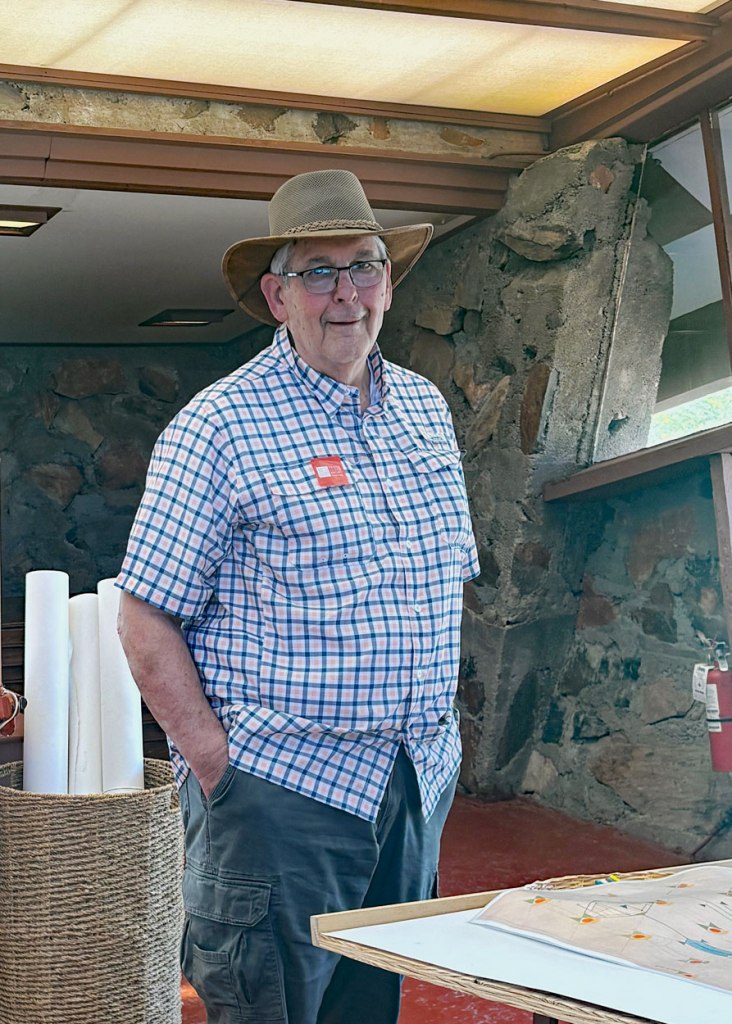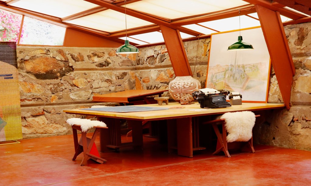Welcome to the personal office of Frank Lloyd Wright. The roof here is made of canvas panels that bring natural light into the space. They can be opened and closed to control natural breezes and cool the space. What about rain you ask, well when you only get about seven inches of rainfall per year, it’s not a big deal…apparently.