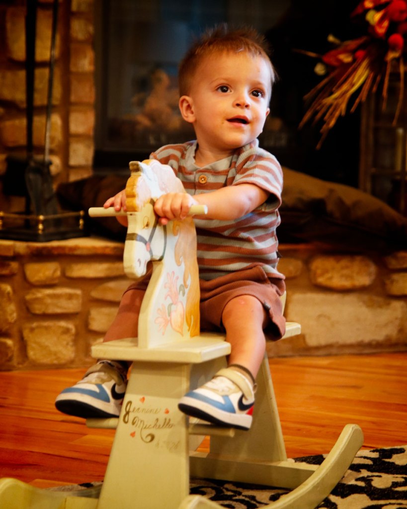 Recently, the youngest great-grandson was in the house for a visit. While he was here, I grabbed the camera and snapped a couple of images of him on things that other generations of the family have enjoyed. The rocking horse was made by my dad and painted by my mother in 1976. They would be this little guy’s great-great-grandparents. They made it for our daughter, who is the grandmother to this young man and his mother as well as his two aunts and his uncle have all ridden this pony. It still has our daughters name and birthday painted on it.